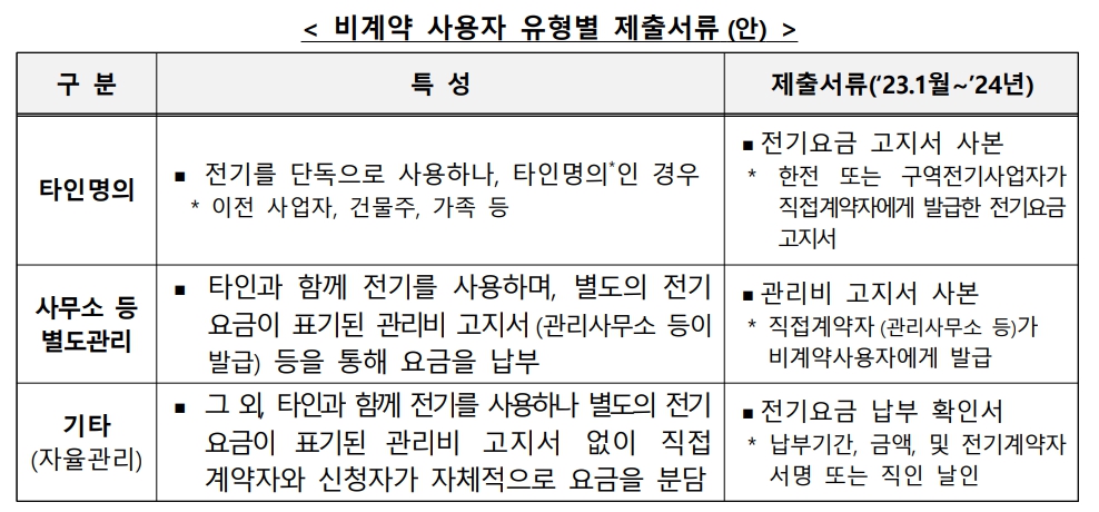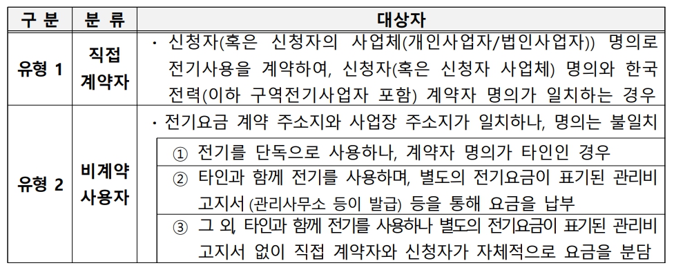 -한국전력(이하 구역전기사업자 포함)이 계약자 DB를 보유하거나, 매월 전기 사용량 확인 및 요금 청구, 차가 관리 가능자